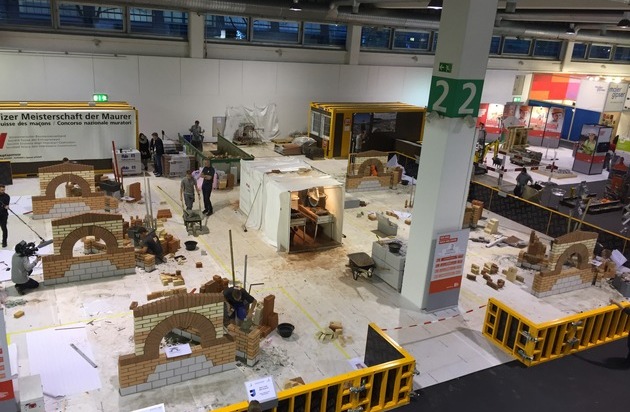 Die Wettkampfarena in der Messe Zürich: Der neue Schweizer Meister Kevin Hofer hat an den SwissSkills vom Mittwoch, 23. November bis Samstag, 26. November 2016 die Herausforderungen der 22 Wettkampfstunden am besten gemeistert. Weiterer Text über ots und www.presseportal.ch/de/nr/100051907 / Die Verwendung dieses Bildes ist für redaktionelle Zwecke honorarfrei. Veröffentlichung bitte unter Quellenangabe: "obs/SBV Schweiz. Baumeisterverband/SchweizerischerBaumeisterverband"
