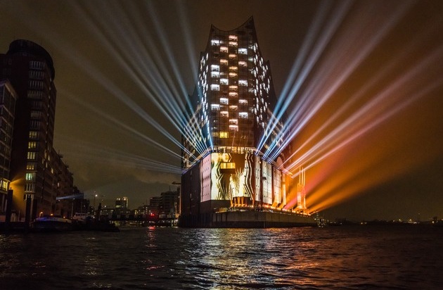 Die spektakuläre Lichtinszenierung an der Außenfassade der Elbphilharmonie, dem neuen Wahrzeichen Hamburgs / Weiterer Text über ots und www.presseportal.de/nr/122866 / Die Verwendung dieses Bildes ist für redaktionelle Zwecke honorarfrei. Veröffentlichung bitte unter Quellenangabe: "obs/Elbphilharmonie Hamburg/Hamburg Musik gGmbH/Caccini"