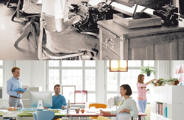 90 Jahre Bürogeschichte: Schreibsaal (1926) und modernes Team-Office von heute Weiterer Text über ots und www.presseportal.de/nr/43223 / Die Verwendung dieses Bildes ist für redaktionelle Zwecke honorarfrei. Veröffentlichung bitte unter Quellenangabe: "obs/Sedus Stoll AG"