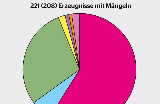 Gesamthaft wurden 221 Erzeugnisse mit Mängeln erfasst, was 14% aller kontrollierten elektrischen Erzeugnisse entspricht. Darin enthalten sind 130 Erzeugnisse mit sicherheitstechnischen Mängeln.