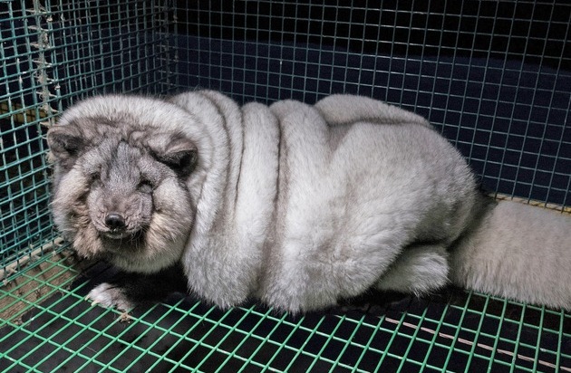 Überzüchteter «Monsterfuchs» in finnischer Pelzfarm. Weiterer Text über ots und www.presseportal.ch/de/nr/100057078 / Die Verwendung dieses Bildes ist für redaktionelle Zwecke honorarfrei. Veröffentlichung bitte unter Quellenangabe: "obs/Zürcher Tierschutz/© Oikeutta eläimille"