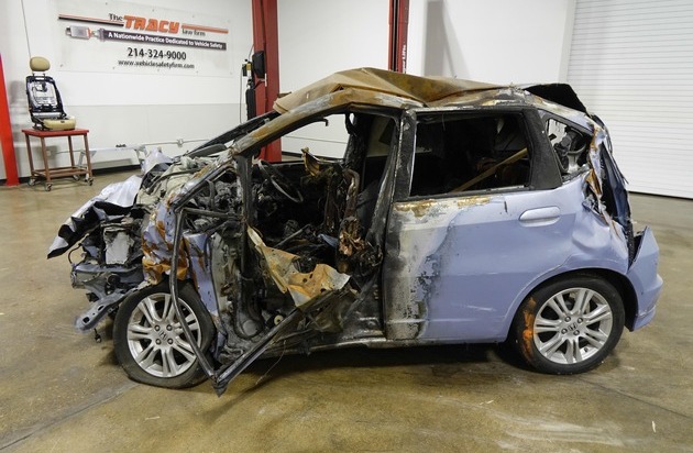 Der Honda Fit, Modelljahrgang 2010, der Seebachans nach der Frontalkollision mit einem Toyota Tundra Pick-up. Weil sich das fälschlicherweise geklebte Dach beim Aufprall vom Dachrahmen gelöst hatte, entstanden falsche Lastpfade. Als Folge davon kollabierte die Fahrgastzelle stärker als das in vergleichbaren Crashtests des Insurance Institute for Highway Safety (IIHS) in den USA der Fall war. Im Frontalcrashtest des IIHS mit Tempo 65 km/h und 40% überdeckung mit einem deformierbaren Hindernis erhielt der Honda Fit, Modelljahr 2010, das Rating ?Gut?. Das bedeutet eine geringe Wahrscheinlichkeit von ernsthaften Verletzungen für die Insassen. Das verschweisste Dach hatte sich nicht vom Dachrahmen gelöst. © The Tracy Law Firm . Weiterer Text über ots und www.presseportal.ch/de/nr/100064457 / Die Verwendung dieses Bildes ist für redaktionelle Zwecke honorarfrei. Veröffentlichung bitte unter Quellenangabe: "obs/IG Swissgarant/The Tracy Law Firm"