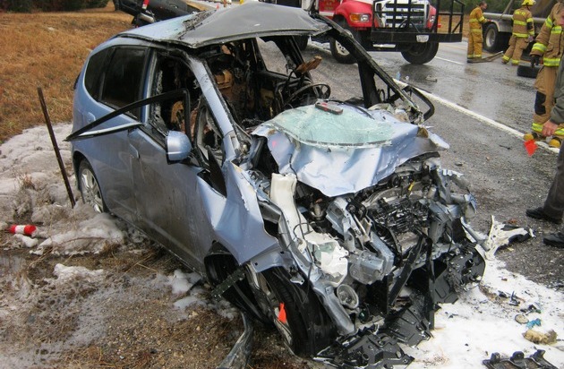 Der Honda Fit, Modelljahrgang 2010, der Seebachans nach der Frontalkollision mit einem Toyota Tundra Pick-up. Weil sich das fälschlicherweise geklebte Dach beim Aufprall vom Dachrahmen gelöst hatte, entstanden falsche Lastpfade. Als Folge davon kollabierte die Fahrgastzelle stärker als das in vergleichbaren Crashtests des Insurance Institute for Highway Safety (IIHS) in den USA der Fall war. Im Frontalcrashtest des IIHS mit Tempo 65 km/h und 40% überdeckung mit einem deformierbaren Hindernis erhielt der Honda Fit, Modelljahr 2010, das Rating ?Gut?. Das bedeutet eine geringe Wahrscheinlichkeit von ernsthaften Verletzungen für die Insassen. Das verschweisste Dach hatte sich nicht vom Dachrahmen gelöst. © The Tracy Law Firm Weiterer Text über ots und www.presseportal.ch/de/nr/100064457 / Die Verwendung dieses Bildes ist für redaktionelle Zwecke honorarfrei. Veröffentlichung bitte unter Quellenangabe: "obs/IG Swissgarant/The Tracy Law Firm"