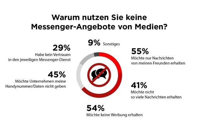 Wie bei allen neuen Formaten stehen auch bei Messenger-Diensten die Verlage vor der Herausforderung einer wirtschaftlichen Umsetzung. Denn zum einen können sich aktuell nur zwölf Prozent der Deutschen vorstellen, Geld für solche Dienste auszugeben, zum anderen lehnen 76 Prozent Werbung Dritter im Rahmen von Messenger-Angeboten von Medien ab.