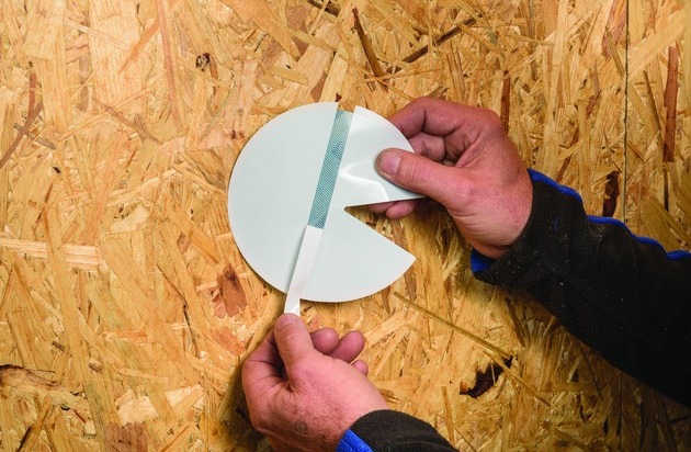 Innovative Anlegezone: Da man die Trennfolie anfangs nur von einem schmalen Fixierstreifen abzieht, lässt sich das Patch sicher in engen Winkeln positionieren, ohne bereits "unterwegs" anzuhaften. Weiterer Text über ots und www.presseportal.de/nr/103616 / Die Verwendung dieses Bildes ist für redaktionelle Zwecke honorarfrei. Veröffentlichung bitte unter Quellenangabe: "obs/MOLL bauökologische Produkte GmbH/MOLL pro clima"