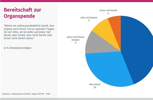 Die Initiative «Organspende fördern - Leben retten» fordert den Systemwechsel von der expliziten Zustimmung hin zur vermuteten Zustimmung, auch Widerspruchslösung genannt. Resultate einer repräsentativen Stimmbürgerumfrage von gfs.bern, die von Swisstransplant in Auftrag gegeben wurde, zeigen eine grundsätzlich positive Einstellung der Schweizerinnen und Schweizer zur Initiative. 76 Prozent der Befragten würden zu diesem frühen Zeitpunkt «eher» oder «bestimmt» für die Vorlage stimmen. Die derzeitige Ja-Reserve von 26 Prozentpunkten über der absoluten Mehrheit von 50 Prozent «Ja» ist überdurchschnittlich hoch. Die Bevölkerung scheint bereit für den Systemwechsel und hat erkannt, dass Lösungen für die Organspende in der Schweiz gefunden werden müssen. Der Vorschlag zur Steigerung der Zahl der Organspenden trifft entsprechend auf weitgehende Sympathie.