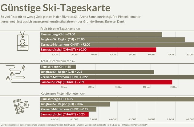 In der Ski-Arena Samnaun/Ischgl gelten Euro-Preise: Auf den Pisten lässt es sich im Vergleich zu anderen Anbietern ausserordentlich günstig fahren. Infografik: Panta Rhei PR
