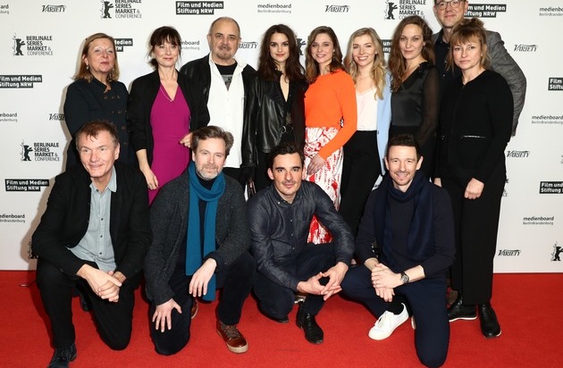 DER PALAST / Uli Edel dreht Eventserie auf der größten Bühne der Welt. BERLIN, GERMANY - FEBRUARY 24: Rodica Doehnert, Inka Friedrich, Uli Edel, Luise Befort, Svenja Jung, Annabella Zetsch, Jeanette Hain, Frank Zervos and Kathrin Bullemer, (u) Ruediger Boess, Matthias Matschke, Hannes Wegener, Oliver Berben at the Constantin Film Showcase during the Berlinale 2020 on February 24, 2020 in Berlin, Germany. (Photo by Sebastian Reuter/Getty Images for Constantin Film) Weiterer Text über ots und www.presseportal.de/nr/126258 / Die Verwendung dieses Bildes ist für redaktionelle Zwecke honorarfrei. Veröffentlichung bitte unter Quellenangabe: "obs/Constantin Television/Sebastian Reuter"