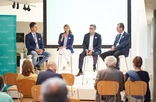 Podiumsdiskussion mit Nektarios Thanasis, fachwerk Kommunikation AG, Nina Suma, Geschäftsführerin ThermalBaden AG, Markus Schneider, Stadtammann Baden, Beat Edelmann, Stiftung Gesundheitsförderung Bad Zurzach + Baden (v.l.) ©ThermalBaden AG
