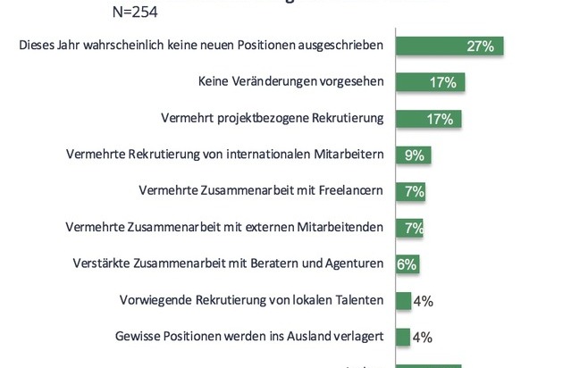 Während 39% der Arbeitgeber mit weniger als zehn Mitarbeitenden glauben, dass in diesem Jahr keine neuen Stellen mehr ausgeschrieben werden, gehen aber 37% der Unternehmen mit mehr als 2'000 Mitarbeitenden davon aus, dass COVID-19 zu keinen Veränderungen in Bezug auf die Rekrutierung neuer Talente führen wird. Insgesamt glauben 27% der Umfrageteilnehmenden, dass im Jahr 2020 keine zusätzlichen neuen Stellen mehr geschaffen werden können. Die Rekrutierungen beziehen sich somit hauptsächlich auf den Ersatz von Mitarbeitenden bzw. aktuell offene Positionen. Weiteres Detail der Studie: 24% der Unternehmen mit 501 bis 2'000 Mitarbeitenden ziehen in Betracht, vermehrt Talente aus dem Ausland anzuziehen.