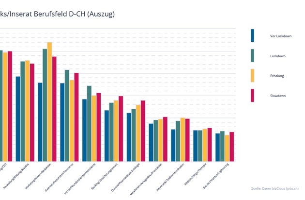 Bei den JobCloud Market Insights werden nicht nur die ausgeschriebenen Stellen, sondern auch die Klicks auf den Jobportalen jobs.ch und jobup.ch analysiert, um so ein Bild über die Nachfrage zu erhalten. Allgemein zeigt sich, dass sich die Aufmerksamkeit für offene Stellen durch die Coronakrise erhöht hat. Im Verhältnis zum Angebot besonders beliebt waren die Bereiche Marketing/Kommunikation/Redaktion, Administration/HR/Consulting/CEO, Bewachung/Polizei/Zoll/Rettung sowie Verwaltung/Bildung/Soziales. "Bei Jobs in den Bereichen Bewachung und Rettung ist das Angebot stets gering und wir sehen bereits seit mehreren Jahren eine besonders grosse Nachfrage. Bei Stellen in der Administration gibt es zwar ein grösseres Angebot, aber dennoch deckt dieses die Nachfrage nicht", so Davide Villa. Die Nachfrage nach Gastro-Jobs ist im Slowdown wieder gestiegen, vor allem in der Romandie.
