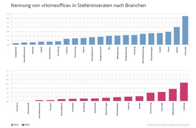 Naturgemäss wird Homeoffice vor allem in den Branchen angeboten, wo ein Arbeiten von zu Hause aus gut durchführbar ist. Besonders häufig wird Homeoffice in Stelleninseraten der Branchen Informatik (7%) und Medien (4%) in der deutschen Schweiz bzw. Verbände (4%), Bildungswesen (3%) und Informatik (2%) in der Romandie erwähnt. Bemerkenswert ist jedoch, dass der Zuwachs an Homeoffice-Nennungen im Coronajahr 2020 in den anderen Branchen deutlich höher ausfiel. «Die Zuwächse zeigen, dass sich Homeoffice auch in eher traditionell geführten Branchen weiterentwickelt, wie etwa in der Finanz- oder Versicherungsbranche», so Villa weiter.