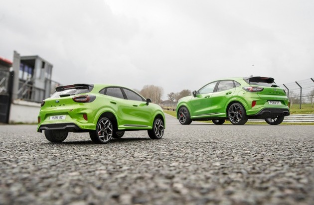 Der Ford Puma ST, das erste Ford Performance-SUV in Europa, steht im Mittelpunkt eines Wettkampfes gegen eine winzige Version von sich selbst: Ort des Showdowns ist die legendäre Rennstrecke Brands Hatch in Großbritannien. Der Puma ST tritt dort gegen ein eigens gebautes, ferngesteuertes Puma ST-Modellauto (Maßstab 1:10) an. Damit die Wettkampf-Bedingungen möglichst fair sind, muss der ,,große" Puma ST den insgesamt 1,9 Kilometer langen Brands Hatch Indy Circuit in einer Zeit von rund 60 Sekunden bewältigen, während der ,,kleine" Puma ST drei Runden auf der 220 Meter langen Brands Hatch-Kartbahn zu absolvieren hat, einer verkleinerten Nachbildung des Indy Circuit, die dessen sechs anspruchsvolle Kurven widerspiegelt. Mit einer Rundenzeit von etwa 20 Sekunden fordert die ferngesteuerte Modellversion des Puma ST seinen großen Wettbewerber heraus. Foto: Ford / Weiterer Text über ots und www.presseportal.ch/de/nr/100000451 / Die Verwendung dieses Bildes ist für redaktionelle Zwecke honorarfrei. Veröffentlichung bitte unter Quellenangabe: "obs/Ford Motor Company Switzerland SA"
