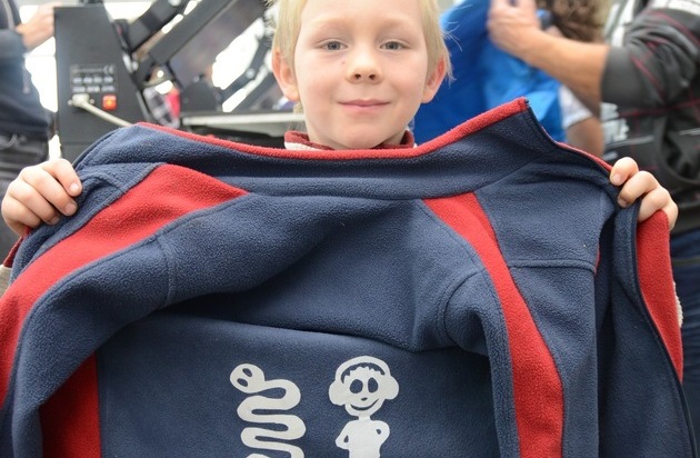 Glückliches Kind mit toll verzierter Jack mit hoher Schutzwirkung durch Sticker.