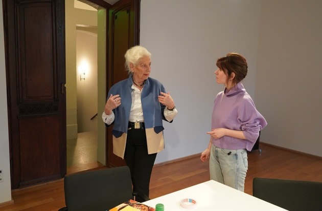 Anna Schiestl (r.) im Gespräch mit Irene Umbricht- Tschamper (l.), die im Haus zum Schlossgarten aufgewachsen ist, Mai 2022. Foto: Forum Schlossplatz.