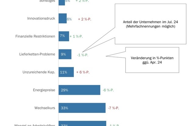 Ein weiteres Problem sind sinkende Margen. Bereits seit zwei Jahren meldet mehr als jedes dritte Unternehmen Rückgänge. Im zweiten Quartal 2024 sanken die Margen bei mehr als 40 Prozent der Unternehmen gegenüber dem Vorjahresquartal. In diesem Zusammenhang ist der Anstieg der Unternehmen, die angegeben haben, aufgrund von fehlenden Eigenmitteln nicht zu investieren, besorgniserregend. Deutet diese Tendenz doch darauf hin, dass den ersten, häufig mit Eigenmitteln finanzierten KMU-MEM langsam der Atem auszugehen droht.