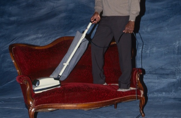 Aus der Serie «Prominente mit Dingen, die sie nie wegwerfen». Sänger Simon Estes mit seinem Staubsauger, November 1992. Foto: Philippe Rossier © StAAG/RBA
