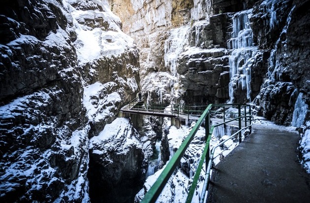 Die Breitachklamm ist die tiefste Felsenschlucht Mitteleuropas und eine der wenigen, die auch im Winter begehbar ist. Dann verwandelt sich die enge Felsenschlucht, die beständig von versprühten Tröpfchen des herabfallenden Wassers berieselt wird, in eine Zauberwelt aus Eis und Schnee. Ein einmaliges Naturerlebnis auf gesicherten Pfaden inmitten funkelnder Eiskristalle.