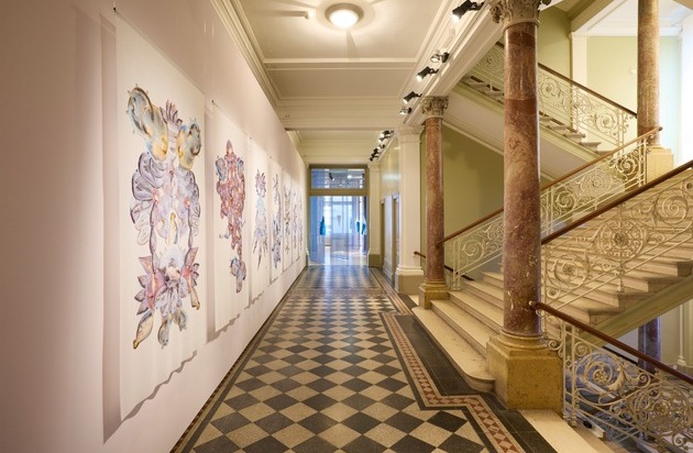 Im Zentrum der Ausstellung hängt die Arbeit von Claudia Vogel. Wie ein Tropfen, der ins Wasser fällt und sich konzentrisch ausbreitet, dehnt sich der Regenduft von Petrichor im Raum aus. „Stilla odorata“ entspringt einer unerschöpflichen Quelle, zeigt uns die Unendlichkeit der Ideen.