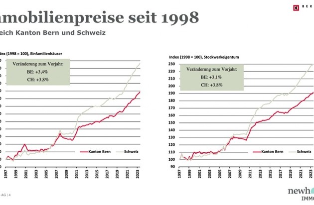 Capelli zeigt auf, dass die Preise für Einfamilienhäuser in den letzten 12 Monaten im Kanton Bern um 3,4 Prozent gestiegen sind, der Anstieg liegt damit leicht unter dem Schweizer Schnitt von 3,8 Prozent. Bei Eigentumswohnungen sieht die Lage ähnlich aus: Im Kanton Bern haben die Preise im Vergleich zum Vorjahr um 3,1 Prozent zugenommen, in der gesamten Schweiz liegt dieser Wert bei 3,8 Prozent.