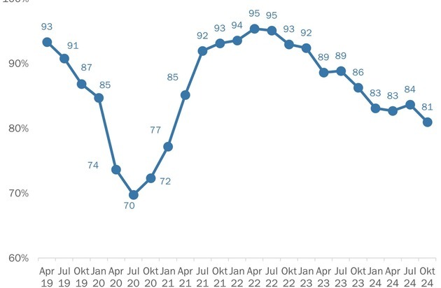 Der Auftragsmangel bleibt auch weiterhin die grösste Herausforderung, gefolgt von den anhaltenden Belastungen durch den starken Franken. Insgesamt verzeichneten 60 Prozent der KMU im dritten Quartal 2024 Umsatzeinbrüche und beinahe gleich viele sinkende Margen. Die Kapazitätsauslastung der Unternehmen liegt derzeit nur knapp über 80 Prozent. Hinzu kommt, dass bei fast einem Drittel der befragten KMU die Produktion nur noch für einen Zeitraum von maximal vier Wochen gesichert ist. Ein Drittel der Unternehmen musste im Vorjahresvergleich Personal abbauen. Bei einem Viertel fehlt es an Eigenmitteln für Investitionen.