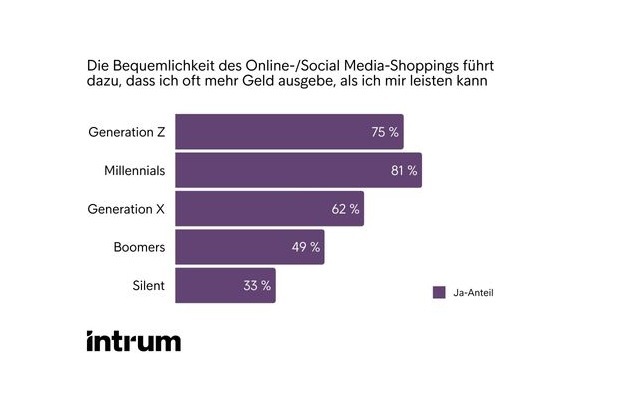 - Konsumverhalten: Online-Shopping und Social Media führen bei 80 % der Millennials und 75 % der Gen Z dazu, mehr auszugeben, als sie sich leisten können. Auch 50 % der Babyboomer fühlen sich durch digitale Kanäle zum Kauf verleitet.