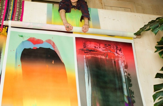 Claudia Caviezels eigens für das Treppenhaus des Kunstmuseums St.Gallen entworfene Wandbehang Glitch besteht aus luxuriösem Baumwollvelours und vereint analoge und digitale Techniken. Das farbenfrohe Design erinnert an Bildschirmstörungen und spiegelt die vertikalen Formen der Treppenspindel wider. Die Künstlerin hat mexikanische Wolldecken namens Serapes auf einem Flachbettscanner hin und her bewegt und dabei unerwartete Bildmuster generiert, bei denen die Kontraste mit Absicht übersteuert wurden. Während die Besuchenden die Treppe hinaufsteigen, tauchen sie in die immersive Umgebung von Glitch ein. Als textile Parallele zu Pipilotti Rists Das Zimmer (das ein überdimensioniertes Fernseh-Wohnzimmer darstellt) lädt Glitch dazu ein, bewegte Bilder neu zu erleben und zu lenken. Mit ihrer intuitiven und experimentellen Herangehensweise schafft Claudia Caviezel Installationen, die spontan und lebendig wirken.