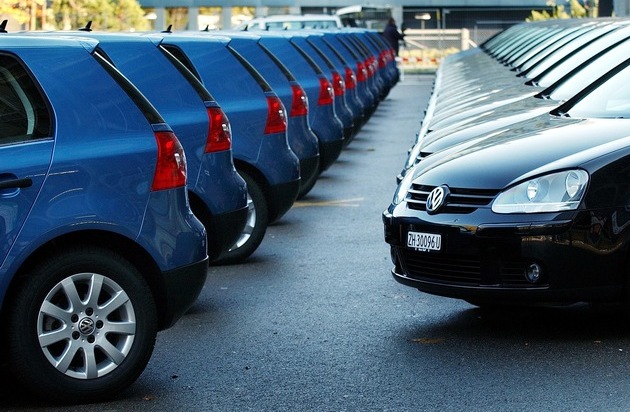 In Reih und Glied aufgereiht steht der neue VW-Golf parat, aufgenommen am Dienstag, 4. November 2003, anlaesslich der Lancierung des neuen VW-Golf auf dem Messeparkplatz in Zuerich-Oerlikon. 350 Garagisten holten alle gleichzeitig ihren neuen Golf ab, der ab dem 7. November zum Preis des alten Golf in den offiziellen VW-Vertretungen zum Verkauf steht. Weiterer Text über ots. Die Verwendung dieses Bildes ist für redaktionelle Zwecke honorarfrei. Abdruck bitte unter Quellenangabe: "obs/AMAG/EDDY RISCH".