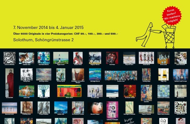 In der riesigen Menge von 6000 qualitativ hochwertigen Unikaten stöbern, über Kunst diskutieren, auswählen und zu unschlagbar günstigen Preisen kaufen - das können Sie am 15. Schweizer Kunst-Supermarkt in Solothurn vom 7. November bis zum 4. Januar 2015. Eröffnung in 3 Wochen. Der Name ist Programm: Der Solothurner Kunst-Supermarkt zeigt ausschliesslich Unikate - keine Massenware und schon gar keine Ausverkauf-Angebote. Dennoch ist die Angebotene Menge riesig. Alle 81 teilnehmenden Künstlerinnen und Künstler stellen mindestens 40 Bilder, aufgeteilt in vier Preiskategorien (CHF 99.-, 199.-, 399.- und 599.-) aus. Im Kunst-Supermarkt finden Sie keine Kunstdrucke oder Kopien, dafür wertvolle, handsignierte Unikate. Der Kunst-Supermarkt richtet sich an Kunstkenner, die ein Schnäppchen machen wollen, aber auch an Laien, welche sich aus purer Freude ein Original erstehen möchten. Die klare Preispolitik und ausgesuchte hochwertige Arbeiten bilden die Grundsteine des Erfolges. Auch am diesjährigen 15. Kunst-Supermarkt rechnen die Organisatoren mit über 20'000 Besucherinnen und Besuchern aus der ganzen Schweiz. Viele der ausstellenden Künstlerinnen und Künstler zeigen ihre Werke zum ersten Mal am Kunst-Supermarkt. Es gibt also viel Neues zu entdecken! Die öffentliche Vernissage des 15. Schweizer Kunst-Supermarktes findet am Donnerstag, 6. November, um 18.00 Uhr in der RothusHalle an der Schöngrünstrasse 2 in Solothurn statt. Öffnungszeiten: Montag-Freitag: 14-20 Uhr Samstag/Sonntag: 11-17 Uhr 24./26./31.12.2014 sowie 2.1.2015 jeweils 11-16 Uhr 25.12.14 und 1.1.2015 geschlossen