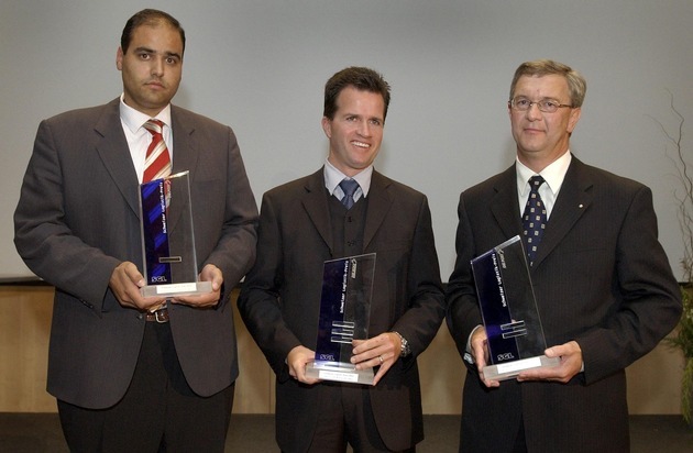 V.l. Daniel Schoeni, Vorsitzender Gsl Schoeni Transport AG Platz 3, Marc Rosendahl, Head of Logistics & SIM Management von Swisscom Mobile Platz 1 und Ulrich Gloor, Leiter Logistik Mtl. Gsl Platz 2 nach der Verleihung des Logistik-Preises 2003 am 30.Oktober 2003 in Basel. Weiterer Text über ots. Die Verwendung dieses Bildes ist für redaktionelle Zwecke honorarfrei. Abdruck bitte unter Quellenangabe: "obs/SGL/PHOTOPRESS/Dominik Pluess"