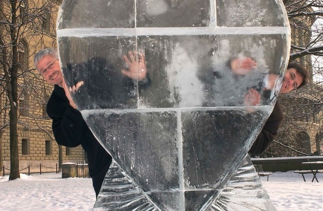 Ein Herz aus Eis als Symbol: Antonio Hautle (Fastenopfer, links) und Reto Gmünder (Brot für Alle, rechts) lancieren auf der Bundeshausterrasse die ökumenische Kampagne gegen Gewalt. Weiterer Text über ots. Die Verwendung dieses Bildes ist für redaktionelle Zwecke honorarfrei. Abdruck bitte unter Quellenangabe: "obs/Fastenopfer"