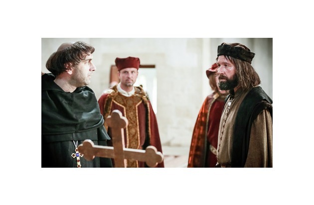 «Die Schweizer»: Auseinandersetzung im Kloster Einsiedeln zwischen dem Abt und Werner Stauffacher. (© SRF/Daniel Ammann). / Weiterer Text ueber OTS und auf https://www.presseportal.ch. Die Verwendung dieses Bildes ist fuer redaktionelle Zwecke honorarfrei. Veroeffentlichung unter Quellenangabe: "OTS.Bild/Publikumsrat SRG Deutschschweiz".
