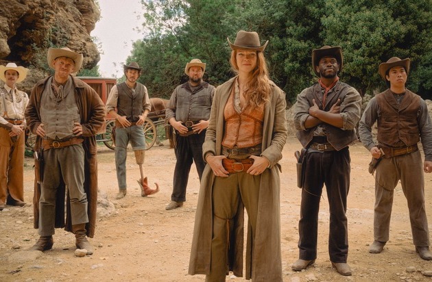 v.l.n.r.: Merlin Sandmeyer, Pit Bukowski, Tobias van Dieken, Daniel Zillmann, Jessica Schwarz, Akeem van Flodrop, Tutty Tran in DAS KANU DES MANITU, ab 14. August 2025 im Kino / Weiterer Text über ots und www.presseportal.de/nr/12946 / Die Verwendung dieses Bildes für redaktionelle Zwecke ist unter Beachtung aller mitgeteilten Nutzungsbedingungen zulässig und dann auch honorarfrei. Veröffentlichung ausschließlich mit Bildrechte-Hinweis.