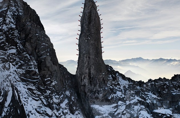 Foto: Mammut/Robert Bösch Wenn 30 Bergführer gleichzeitig eine Felsnadel erklimmen, dann kann nur Mammut dahinter stecken. Zusammen mit Fotograf Robert Bösch wurde Mitte September 2012 ein weiteres unglaubliches Shooting für die mittlerweile legendäre Mammut-Kampagne realisiert. / Weiterer Text ueber ots und auf https://www.presseportal.ch. Die Verwendung dieses Bildes ist fuer redaktionelle Zwecke honorarfrei. Veröffentlichung unter Quellenangabe: "ots.Bild/Mammut Sports Group".
