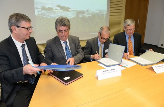 Swiss Cancer Center - Lausanne: von links nach rechts : Prof. Pierre-François Leyvraz, Directeur général du CHUV - Prof. Patrick Aebischer, Président de l'EPFL, M. Yves Paternot, Président de la Fondation ISREC et Prof. Dominique Arlettaz, Recteur de l'Université de Lausanne. Weiterer Text ueber ots und auf https://www.presseportal.ch. Die Verwendung dieses Bildes ist fuer redaktionelle Zwecke honorarfrei. Veroeffentlichung unter Quellenangabe: "ots.Bild/ISREC Stiftung".