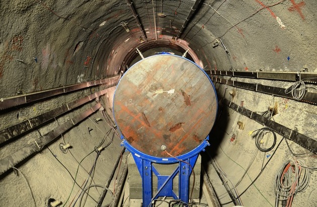 Nagra, Fe-Experiment, Full Scale Emplacement Demonstration, der Versuchsstollen im Felslabor Mont Terri mit dem präzise platzierten Versuchsbehälter, die Hohlräume werden anschliessend mit der Verfüllmaschine mit Bentonit-Granulat verfüllt. Weiterer Text über OTS und www.presseportal.ch/pm/100004441 / Die Verwendung dieses Bildes ist für redaktionelle Zwecke honorarfrei. Veröffentlichung bitte unter Quellenangabe: "obs/Nagra"