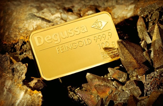 100 g Degussa Goldbarren, Die Degussa Barren werden von Scheideanstalten in der Schweiz hergestellt, die bei der London Bullion Market Association LBMA zertifiziert sind und so hoechste Standards an Reinheit und Qualitaet garantieren, Degussa Goldhandel, Frankfurt, Abdruck frei Die Verwendung dieses Bildes ist fuer redaktionelle Zwecke honorarfrei. Veroeffentlichung bitte unter Quellenangabe: "ots.Bild/Degussa Goldhandel GmbH"