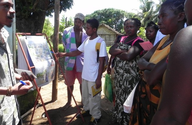 Ein Team von Mad'Eole veranstaltet im Rahmen einer Sensibilisierungskampagne "öffentliche Lesungen" des Comics. Viele Erwachsene können auch die relativ einfachen Texte in den Sprechblasen nicht lesen, obwohl die Texte im Dialekt des Nordens von Madagaskar geschrieben sind, und benötigen deshalb Lesehilfe. (Foto: Mad'Eole) / Weiterer Text ueber ots und auf https://www.presseportal.ch. Die Verwendung dieses Bildes ist fuer redaktionelle Zwecke honorarfrei. Veroeffentlichung unter Quellenangabe: "ots.Bild/Förderverein Mad'Eole Schweiz".