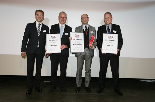 Michel Tinguely (2.v.l. Direktor After Sales JAGUAR Land Rover Schweiz AG) nimmt den Preis für den 2.Platz in der Kategorie Oberklasse-Limousine für den JAGUAR XF entgegen. Weiterer Text ueber OTS und auf https://www.presseportal.ch. Die Verwendung dieses Bildes ist fuer redaktionelle Zwecke honorarfrei. Veroeffentlichung unter Quellenangabe: "OTS.Bild/JAGUAR Land Rover Schweiz AG".