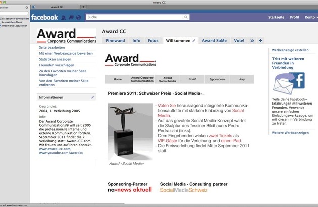unter: http://www.presseportal.ch/de/pm/100008000 -Als Premiere lanciert der Veranstalter des Award Corporate Communications® als Kategorienpreis den Award "Social Media". Für diesen Publikumspreis kann ab März via der Facebook Fanpage des Award-CC gevotet werden. Die Kommunikation dazu erfolgt crossmedial auf diversen Media-Plattformen sowie mittels Road Shows bei nationalen Branchenclubs. Auf die auserwählte Lieblingskampagne mit integrierten Social Media Massnahmen wartet eine Skulptur vom Tessiner Bildhauer Pedro Pedrazzini. Als Moderator dieses Preises zeichnet die Expertengruppe Social Media Schweiz verantwortlich, Sponsor ist die news aktuell (Schweiz) AG. Projektvorschläge für den Award-SM können ab sofort eingegeben werden, das Voting selbst startet im März.