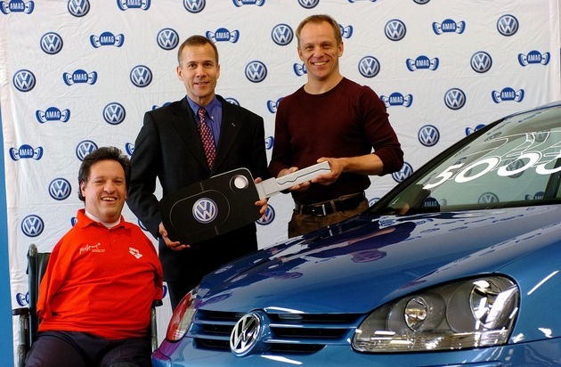 Andreas Iseli, Mitte, Markenchef VW, ueberreicht Christian Lohr, links, Zentralpraesident von PLUSPORT und Lukas Christen, rechts, Leichtathletik-Olympiasieger 1992, 1996 und 2000, den 500'000sten in die Schweiz importierten VW Golf am 3. Februar 2004 im Amag Auslieferungszentrum Birrfeld. Weiterer Text über ots. Die Verwendung dieses Bildes ist für redaktionelle Zwecke honorarfrei. Abdruck bitte unter Quellenangabe: "obs/Markus Stuecklin - AMAG".