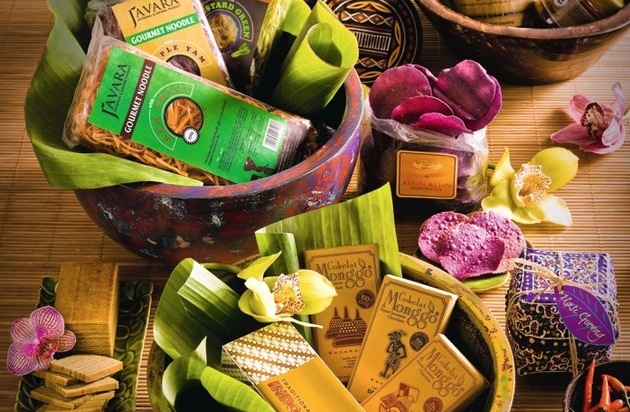 DELICIOUS BALI. Würzig marinierte Saté-Spiesschen am Strassenrand, ein Bananenblatt gefüllt mit Ente und Reis... Die balinesische Küche ist geprägt vom Alltag der Menschen und basiert auf einer Vielfalt an Fleisch- und Fischgerichten, gegrillten Meeresfrüchten und Gemüse. Typische Gerichte sind hier das Sambel Udang, Riesencrevetten an scharfer Tomatensauce, oder das breit bekannte Nasi Goreng, gebratener Reis mit Riesencrevetten und Poulet. Die schön verpackte Avopri Saté Sauce, die Alun Alun Cassava Chips, die Eat.Art Chilis oder die Traditional Indonesian Layer Cakes eignen sich ebenfalls hervorragend als Gastgeschenke für die nächste Einladung (Seite 20 und 21).