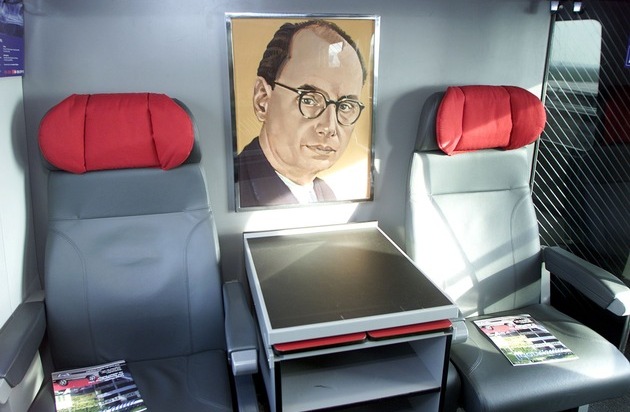 Das Portrait von Jean Rudolf von Salis schmueckt ein Abteil des auf den Namen des Weltchronisten getauften SBB Expo.02 Neigezuges, aufgenommen am Samstag, 9. Maerz 2002 in Lupfig (AG), anlaesslich der Zugtaufe zur 50 jaehrigen Zusammenarbeit der SBB und der AMAG. (PHOTOPRESS/Michele Limina) Siehe via SDA verbreitete ots-Meldung