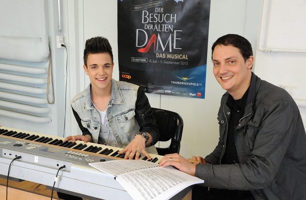 Luca Hänni mit Co-Komponist Moritz Schneider. / Weiterer Text ueber ots und auf https://www.presseportal.ch. Die Verwendung dieses Bildes ist fuer redaktionelle Zwecke honorarfrei. Veröffentlichung unter Quellenangabe: "OTS.Bild/thunerSeespiele AG"