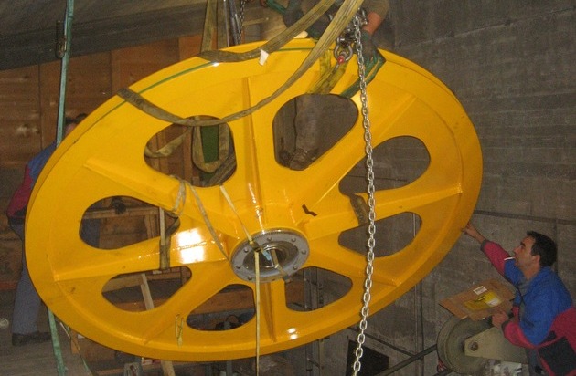 Schilthornbahn AG: Neue Umlenkräder eingebaut. In der Station drinnen muss das Rad an den richtigen Platz manövriert werden. / Weiterer Text ueber ots und auf https://www.presseportal.ch. Die Verwendung dieses Bildes ist fuer redaktionelle Zwecke honorarfrei. Veröffentlichung unter Quellenangabe: "ots.Bild/Schilthornbahn AG".