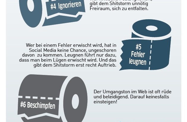 Wer den Schaden eines Shitstorms so gering wie möglich halten will, der sollte die größten zehn Fehler unbedingt vermeiden. Die dpa-Tochter news aktuell und Faktenkontor haben herausgearbeitet, was zu beachten ist, wenn Kommunikationsfachleute im Internet einem Shitstorm gegenüber stehen und wie es gelingen kann, den Schaden in Grenzen zu halten.