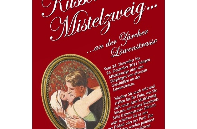 Und so geht's: Vom 24. November bis 24. Dezember sind die Eingänge der teilnehmenden Geschäfte an der Löwenstrasse mit den traditionellen Mistelzweigen dekoriert. Jedes küssende Pärchen unter einem Mistelzweig postet ihr Foto auf folgender Facebook-Seite: https://www.facebook.com/pages/Löwenstrasse-Zürich/101111179996075 Eine Jury wird dann den schönsten Kuss mit einem wundervollen, romantischen Preis belohnen.