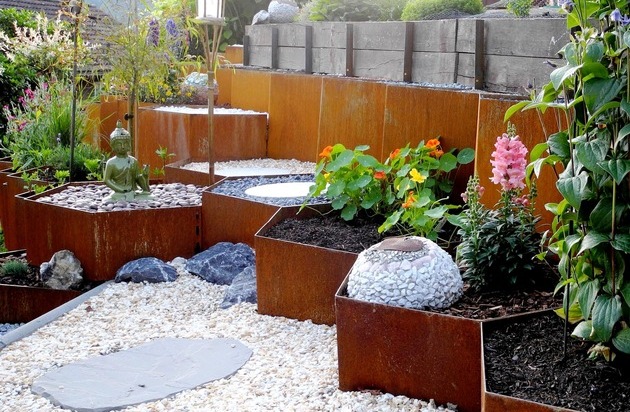 BÖGART Böschungsbeete aus Metallelementen roh/rostend. Weiterer Text ueber ots und auf https://www.presseportal.ch. Die Verwendung dieses Bildes ist fuer redaktionelle Zwecke honorarfrei. Veroeffentlichung unter Quellenangabe: "OTS.Bild/BÖGART".