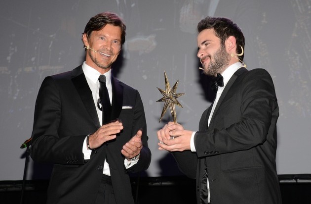 Laszlo Schneider nahm den MedienStar-Award für seinen Vater entgegen. Christoph Richterich (Richterich & Partner AG), Präsident der Jury, überreichte den Preis. Weiterer Text über OTS und www.presseportal.ch/pm/100056101 / Die Verwendung dieses Bildes ist für redaktionelle Zwecke honorarfrei. Veröffentlichung bitte unter Quellenangabe: "OTS.Bild/Presse- & Medienball"