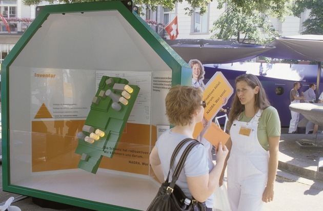 Auf dem Fronwagplatz in Schaffhausen stehen seit heute überdimensionierte Abfallcontainer, wie wir sie aus der geordneten Entsorgung von Haushaltabfällen kennen. Die NAGRA, die nationale Genossenschaft für die Lagerung radioaktiver Abfälle, stellt dort mit einer informativ und spannend konzipierten "Guckkasten"-Ausstellung ihre Aufgabe im Dienste der gesicherten und geordneten Entsorgung unserer radioaktiven Abfälle vor. Der Slogan der Tour lautet: "Die Schweiz hat radioaktiven Abfall. Wir kümmern uns darum. NAGRA. Wer sonst." Politik, Medien und Bevölkerung haben Gelegenheit, mit der Standcrew der NAGRA die Bedeutung des Entsorgungsnachweises für die Region zu diskutieren und die oft komplexen Fragestellungen im Zusammenhang mit der Entsorgung radioaktiver Abfälle in der Schweiz direkt zu erörtern.